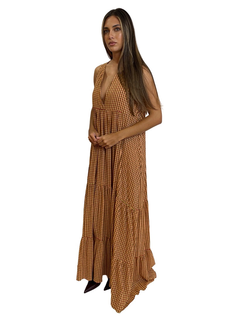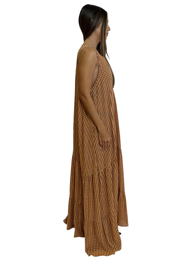 Beatrice Red / Yellow Gingham Sleeveless Tiered Dress. Size: L