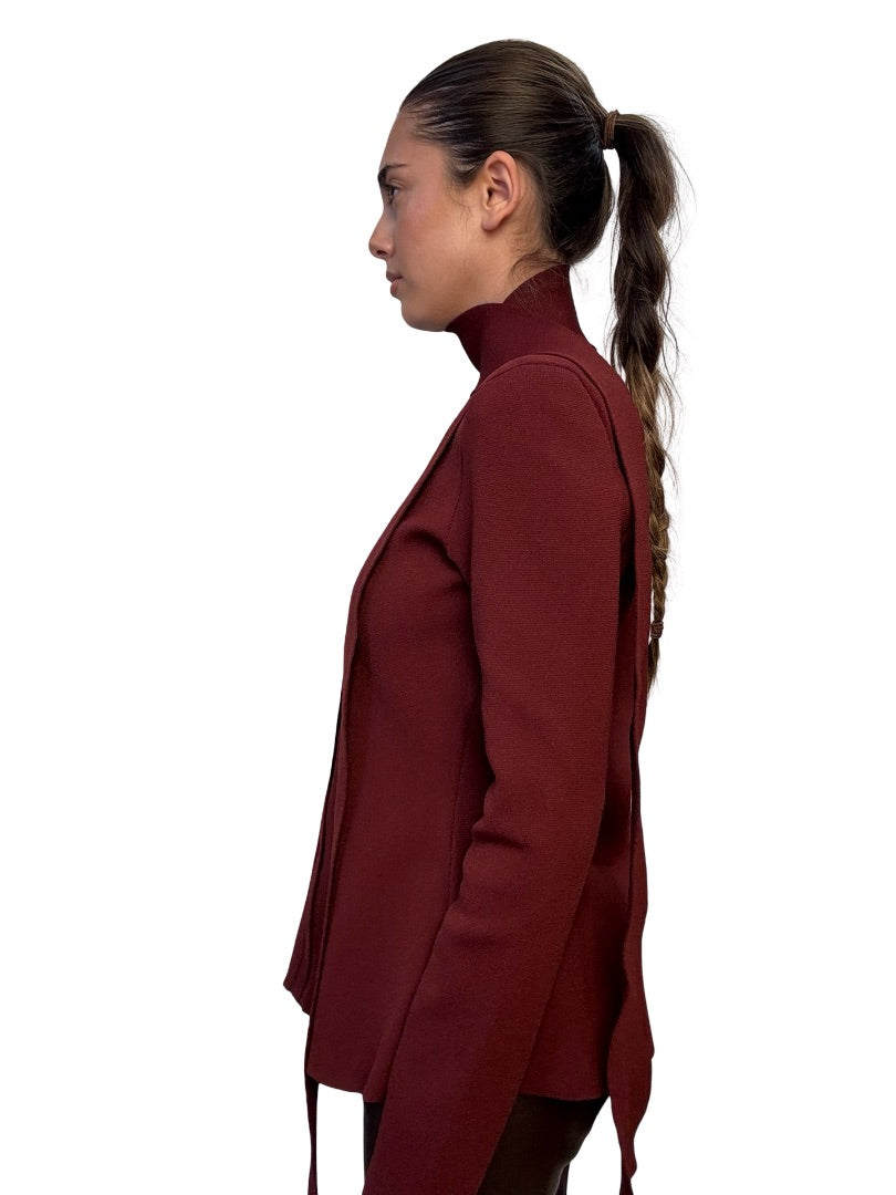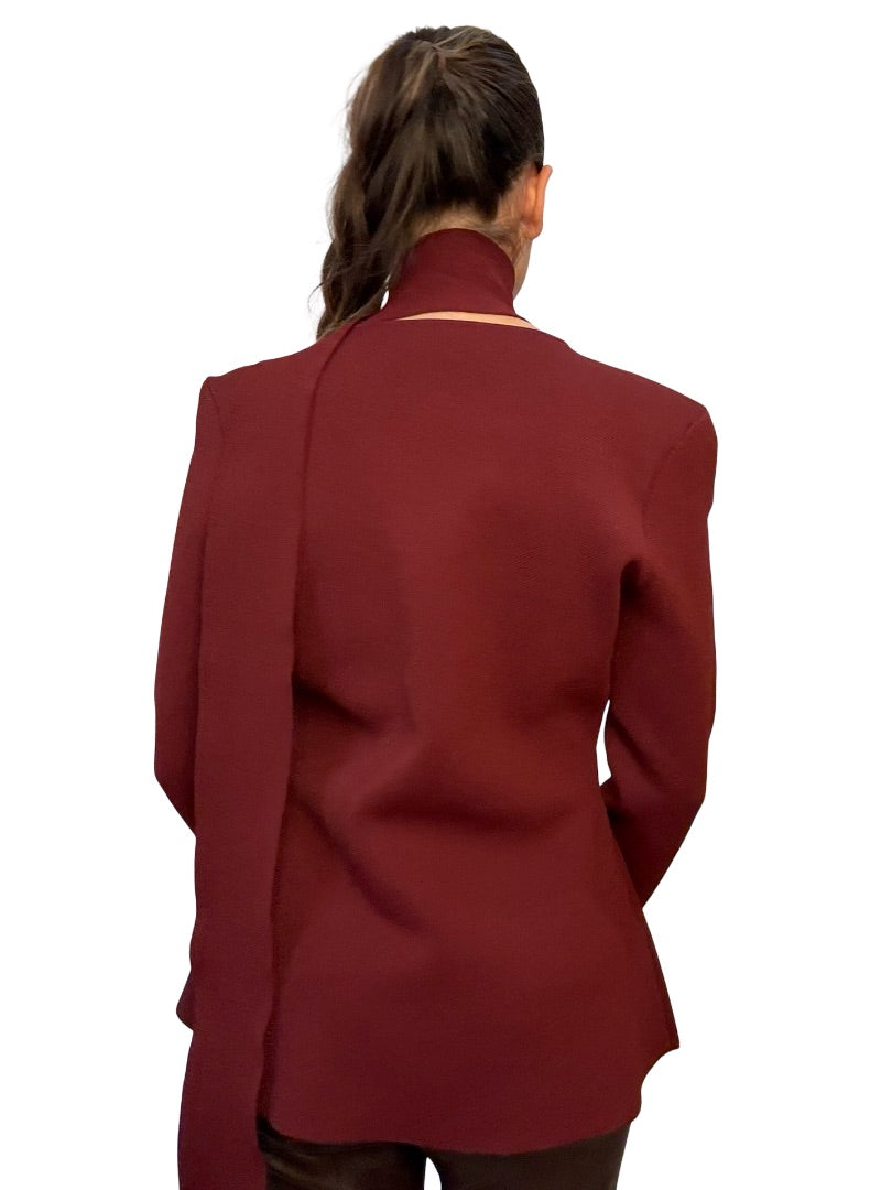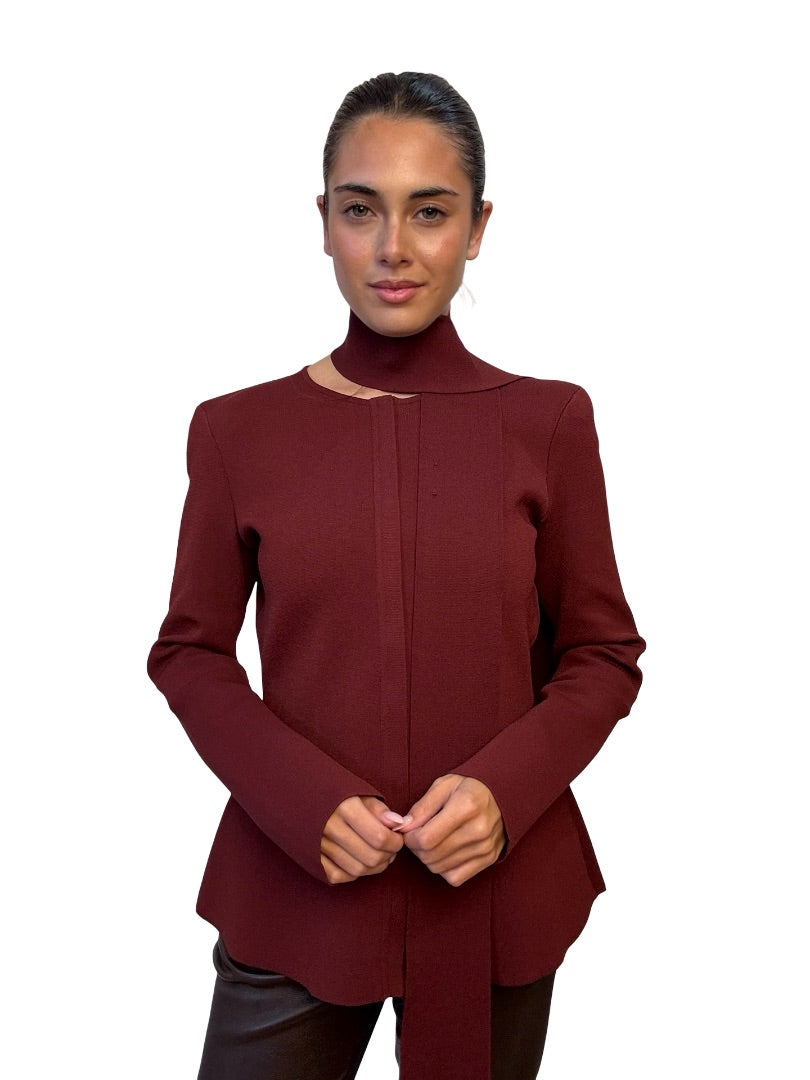 Scanlan Theodore Maroon Crepe Knit Zip Up Crew Neck Blouse. Size: L